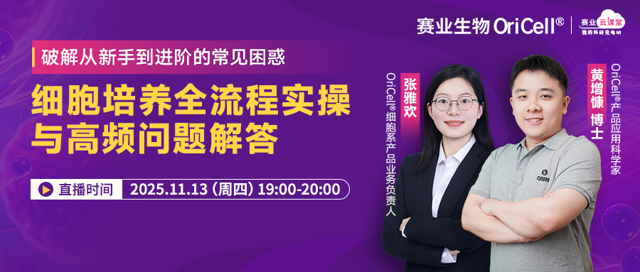 11月13日(周四)晚7点,新一期“赛业云课堂”特邀赛业生物OriCell®产品应用科学家黄增慷博士、赛业生物OriCell®细胞系产品业务负责人张雅欢两位资深技术老师,一起助攻细胞培养难题,提供实打实的解决妙招。不管你是刚接触细胞培养的新手,还是想解决进阶难题的科研人,这场针对细胞培养答疑的专题直播都能帮你避开坑、提效率。马上免费报名课程,还有机会参与暖脚器、暖桌垫等冬日好物抽奖。