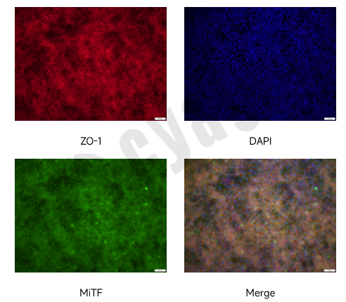 通过免疫荧光染色,检测ZO-1、MiTF两个个标记基因,呈现阳性结果。