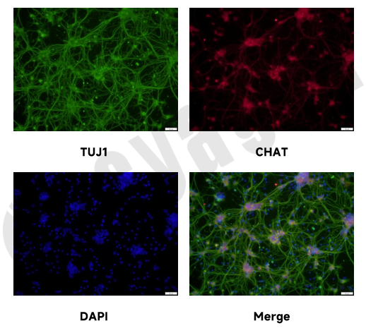 将细胞分化为MN,通过免疫荧光染色,检测CHAT、TUJ1两个标记基因,呈现阳性结果。